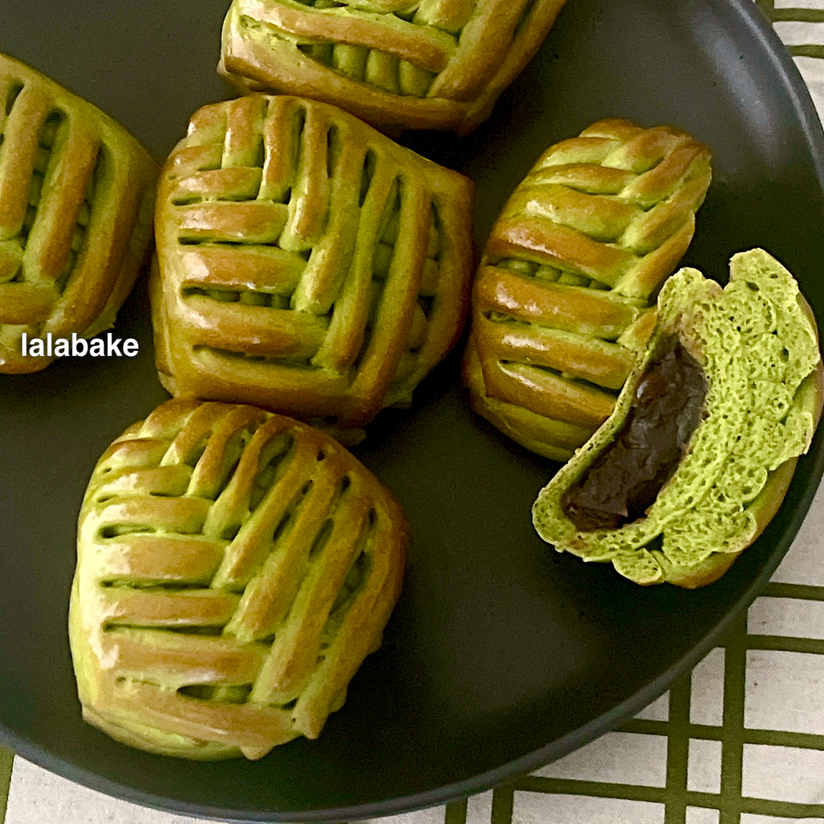 香り高い抹茶風味の生地でつぶあんを包み、葉っぱの形に成形します。新緑の季節にぴったりの、見た目も味わいも楽しめるパン。