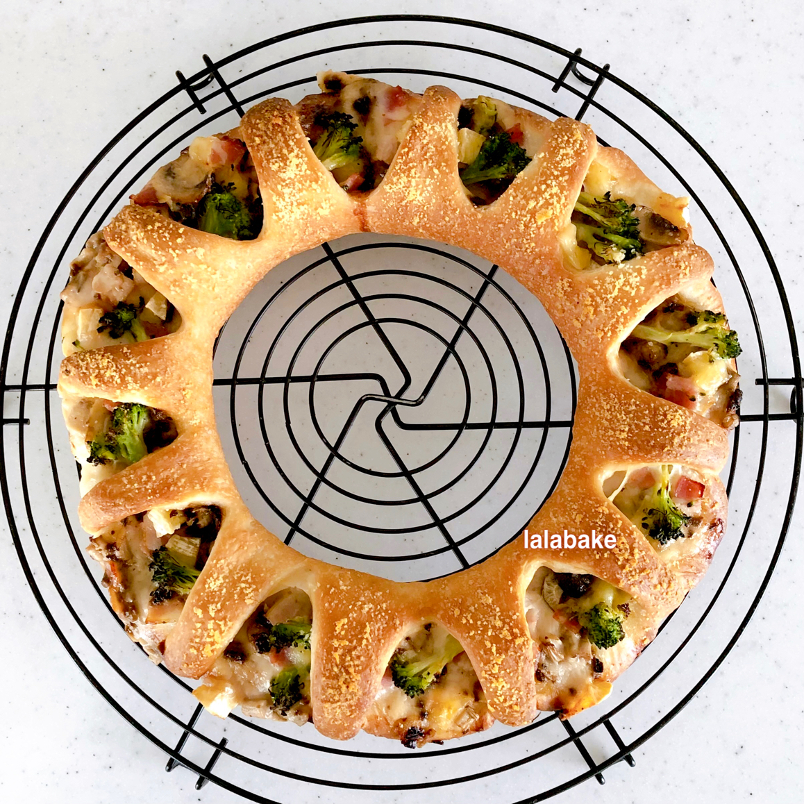 クリスマスリースのような成形が華やかなピザ。米粉入りの生地に、ポルチーニ香るホワイトソースと、カマンベールチーズやきのこなどの具材を入れて焼き上げます。