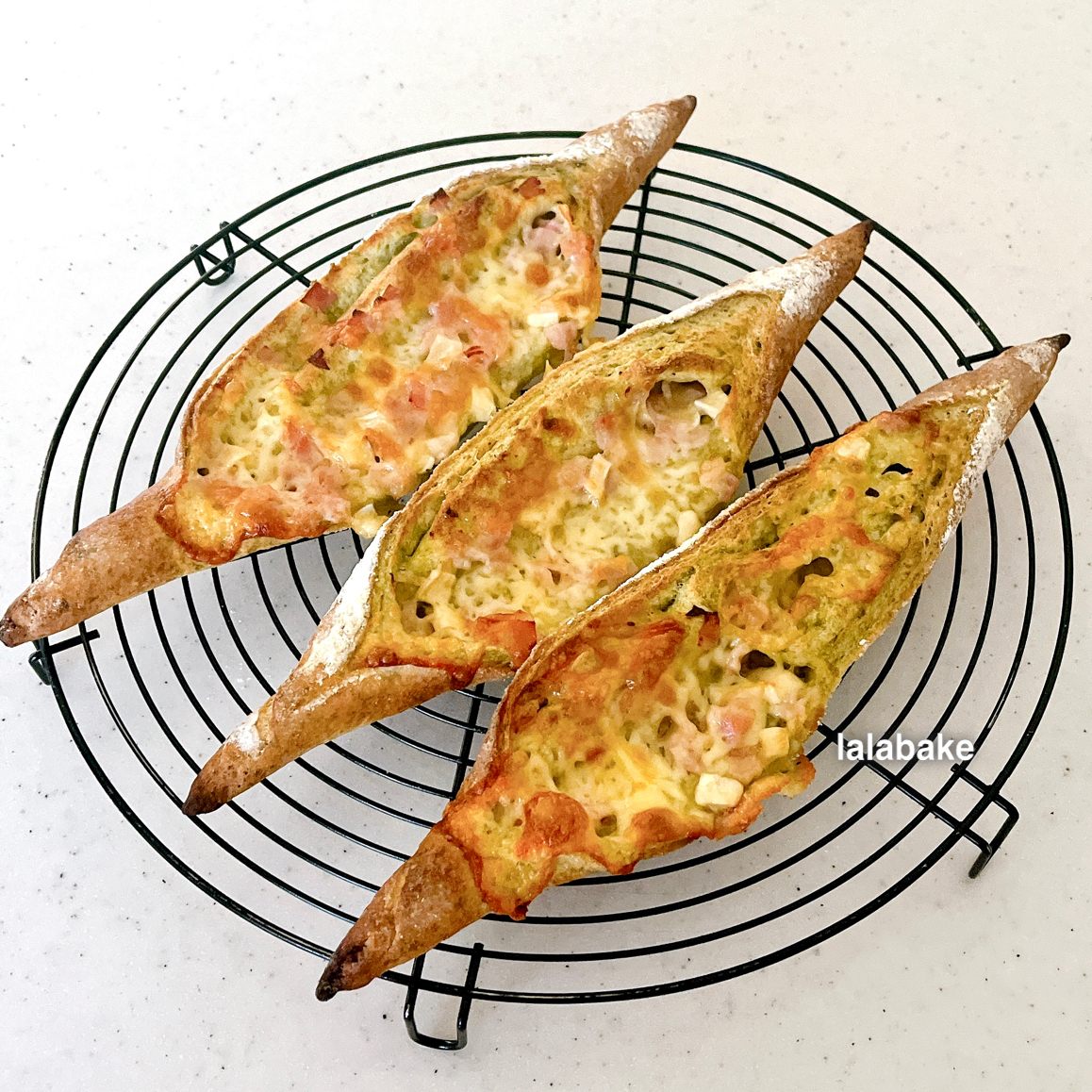 三重県志摩市産のあおさをたっぷりと生地に練り込み、カマンベールチーズやベーコンなどを巻き、クープを入れて焼き上げます。あおさと香ばしいチーズの香りに食欲がそそられます。
