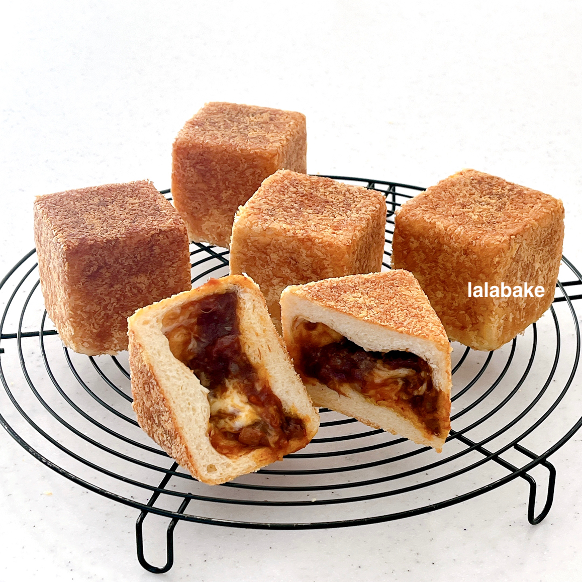 ビーフシチュー味のフィリングを包み、パン粉をつけた生地をキューブ型に入れて焼き上げます。スクエアの形がかわいい、冬のお総菜パンです