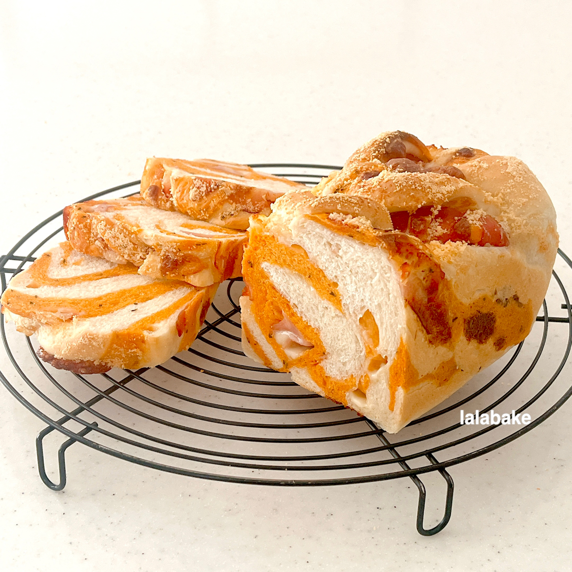 生地を長くのばして渦状に成形し、コーンベーコンマヨネーズとチーズをのせて焼き上げます。